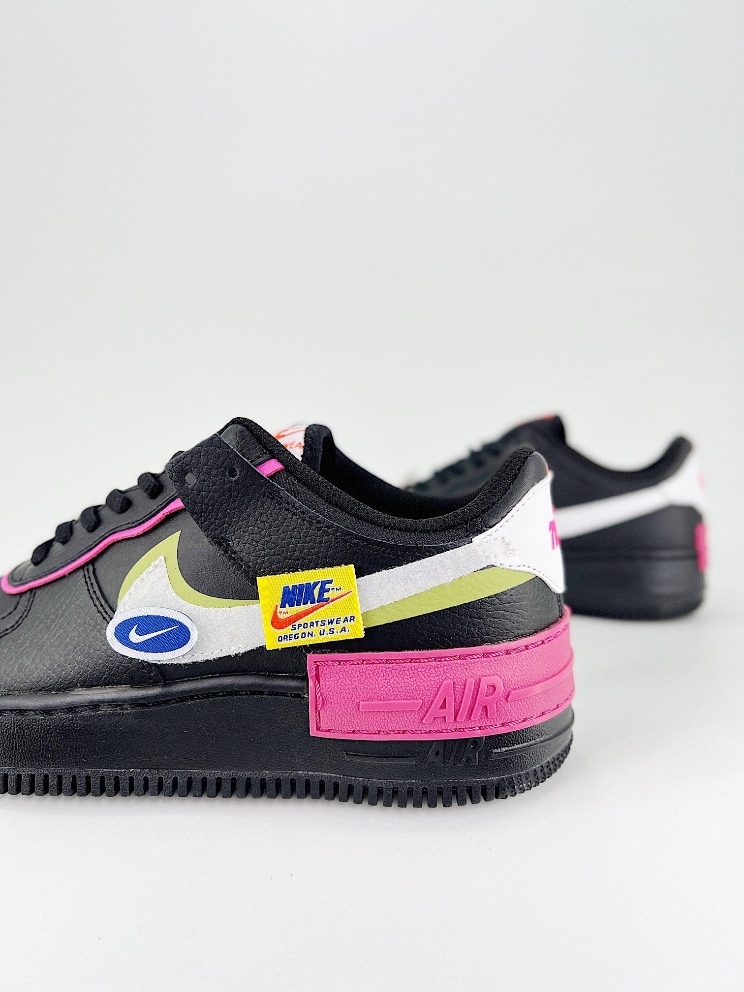 Esta oferta vem vestida com um esquema de cores Preto, Limelight, Cósmica Fúcsia e Branco. Possui uma mistura de couro caído e liso com Swooshes de dupla camada, um deles vem em um tecido de velcro que permite colocar diferentes remendos temáticos da Nike. A dupla camada continua nos saltos, rótulos de língua e marca de palmilha dupla. Uma sola de borracha preta completa o design.